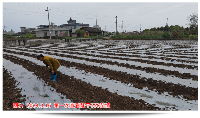 回想年前說要召開苗期會議的時候,大家都有點不知所措,因為沒有先例,客戶也并不看好苗期會議呈現的效果。決定了要做,那就全力以赴,第一個問題就是示范田的選點,要考慮播種時間、地塊條件、地塊面積、交通便捷、人員配合等,權衡各要素最終確定在樂山夾江找地。樂山夾江水源條件好有東風堰灌溉,土質肥沃常年種植蔬菜、藥材,地勢平坦面積規整更易找到幾畝連片地塊,播種時間較早能夠保證4月中旬苗子適合觀摩,種植戶經驗豐富懂得控制密度和水肥管理。從年前初選溝通,到最后落實,由于交通、前茬、面積等因素,前后也溝通了6位種植戶、經歷了3次換地,才最終在2月20日確定了地塊,并于3月5日完成播種。設計之初首先考慮的就是密度,該地塊密度有2種設計,一是寬窄行(雙株)的3200株/畝,二是等行距(單株)2600株/畝,同時保證外觀性狀和產量性狀都有較高的體現。其次是保證整田無雜草,苗齊苗壯,從播種短短一個月時間內我去查看了4次。播種時已做好了地塊除草,確定好行距、株距,然后每窩3粒播種;第一次查看,及時整理薄膜的遮蓋,了解墑情、苗情,如出現整箱出苗不好,及時灌溉保苗;出苗整齊后,及時補苗肥,促進長勢;苗期會議前,插牌、美化地塊,間苗,祛除弱苗,展現示范地的最佳狀態。田間管理實操工作繁重且枯燥,但當看見客戶在地里笑著拍攝隆平558的情景,就讓我依舊相信每一份努力的背后,一定會有驚喜!